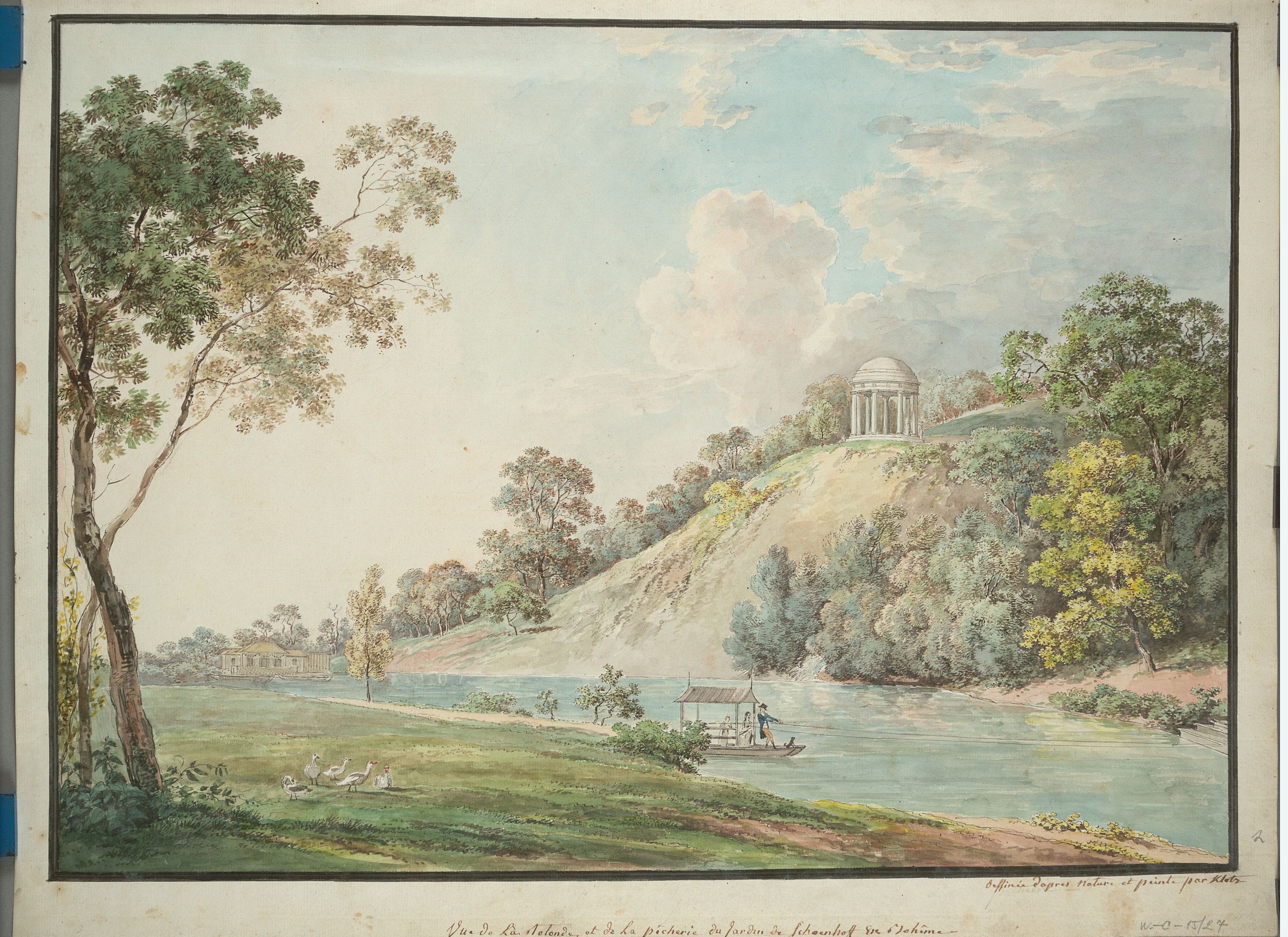 Aquarell von Simon Petrus Klotz, um 1799: Der große Teich und Gloriet (im Schönhofer Park)